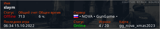 Играет на Counter Strike Source сервере. Страна: РоссияПервый раз замечен 17:09 05.09.2022