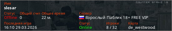 Играет на Counter Strike 1.6 сервере. Страна: РоссияПервый раз замечен 16:48 09.03.2026