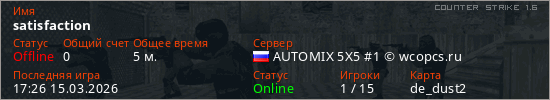 Играет на Counter Strike 1.6 сервере. Страна: РоссияПервый раз замечен 17:09 15.03.2026