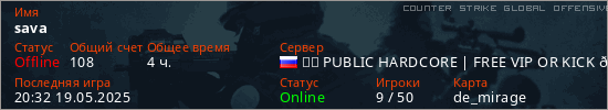 Играет на Counter Strike Global Offensive сервере. Страна: РоссияПервый раз замечен 17:42 28.01.2025