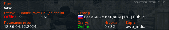 Играет на Counter Strike 1.6 сервере. Страна: РоссияПервый раз замечен 12:50 21.05.2023