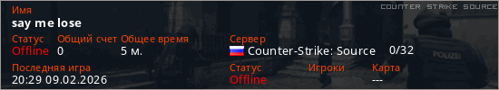 Играет на Counter Strike Source сервере. Страна: РоссияПервый раз замечен 19:58 09.02.2026