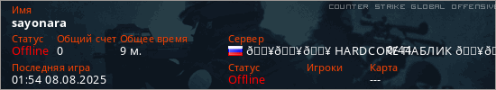 Играет на Counter Strike Global Offensive сервере. Страна: РоссияПервый раз замечен 17:59 01.08.2025