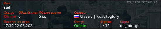 Играет на Counter Strike 1.6 сервере. Страна: РоссияПервый раз замечен 17:35 22.06.2024