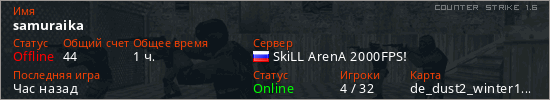 Играет на Counter Strike 1.6 сервере. Страна: РоссияПервый раз замечен 23:50 20.12.2025