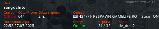Последний раз был в сети 22:52 27.07.2025 Игрок с таким ником замечен на 11 серверах