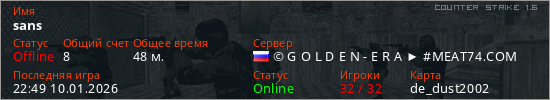 Играет на Counter Strike 1.6 сервере. Страна: РоссияПервый раз замечен 12:38 04.07.2024