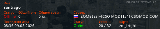 Играет на Counter Strike 1.6 сервере. Страна: РоссияПервый раз замечен 08:32 09.03.2026