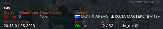 Играет на Counter Strike 1.6 сервере. Страна: РоссияПервый раз замечен 20:15 01.08.2023