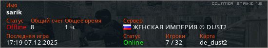 Играет на Counter Strike 1.6 сервере. Страна: РоссияПервый раз замечен 18:15 18.01.2023