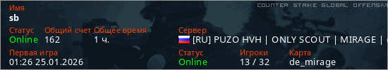 Играет на Counter Strike Global Offensive сервере. Страна: РоссияПервый раз замечен 01:26 25.01.2026
