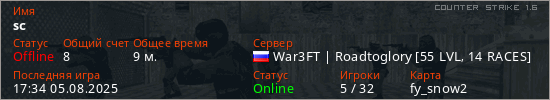 Последний раз был в сети 17:34 05.08.2025 Игрок с таким ником замечен на 17 серверах