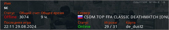 Последний раз был в сети 22:11 29.08.2024 Игрок с таким ником замечен на 17 серверах
