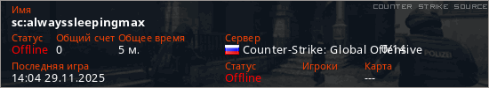 Играет на Counter Strike Source сервере. Страна: РоссияПервый раз замечен 14:02 29.11.2025