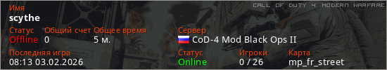 Играет на Call of Duty 4: Modern Warfare сервере. Страна: РоссияПервый раз замечен 08:11 03.02.2026