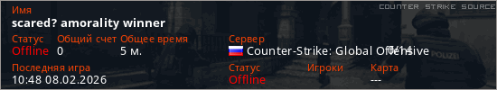 Играет на Counter Strike Source сервере. Страна: РоссияПервый раз замечен 10:42 08.02.2026