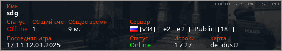 Играет на Counter Strike Source сервере. Страна: РоссияПервый раз замечен 16:11 07.01.2025