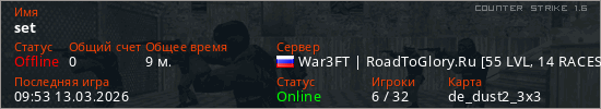 Играет на Counter Strike 1.6 сервере. Страна: РоссияПервый раз замечен 14:41 11.03.2026