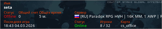 Играет на Counter Strike Global Offensive сервере. Страна: РоссияПервый раз замечен 18:39 04.03.2026