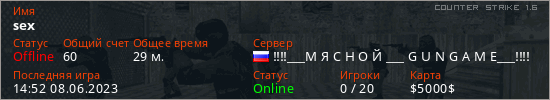 Играет на Counter Strike 1.6 сервере. Страна: РоссияПервый раз замечен 22:24 29.06.2022