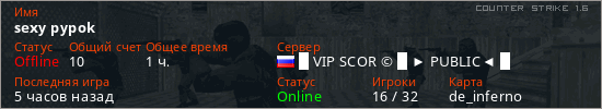 Играет на Counter Strike 1.6 сервере. Страна: РоссияПервый раз замечен 16:10 16.12.2025