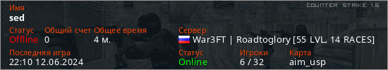Играет на Counter Strike 1.6 сервере. Страна: РоссияПервый раз замечен 22:08 12.06.2024