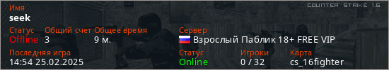 Играет на Counter Strike 1.6 сервере. Страна: РоссияПервый раз замечен 18:09 28.01.2024