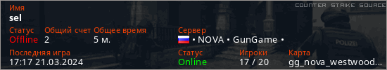 Играет на Counter Strike Source сервере. Страна: РоссияПервый раз замечен 17:13 21.03.2024