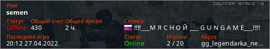 Последний раз был в сети 20:12 27.04.2022 Игрок с таким ником замечен на 31 сервере