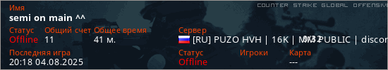 Играет на Counter Strike Global Offensive сервере. Страна: РоссияПервый раз замечен 21:48 31.07.2025