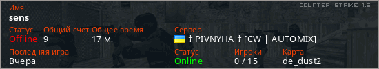 Последний раз был в сети Вчера Игрок с таким ником замечен на 17 серверах