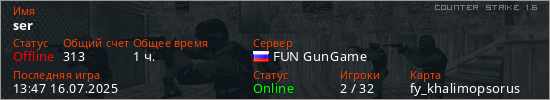 Играет на Counter Strike 1.6 сервере. Страна: РоссияПервый раз замечен 16:16 15.01.2023