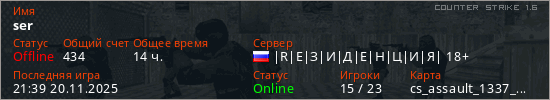 Играет на Counter Strike 1.6 сервере. Страна: РоссияПервый раз замечен 12:06 25.01.2019