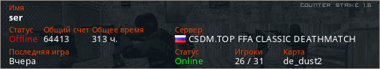 Играет на Counter Strike 1.6 сервере. Страна: РоссияПервый раз замечен 23:10 11.11.2019