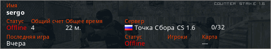 Играет на Counter Strike 1.6 сервере. Страна: РоссияПервый раз замечен 11:57 03.04.2026
