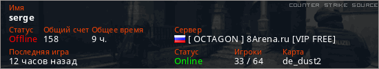Последний раз был в сети 8 часов назад Игрок с таким ником замечен на 17 серверах