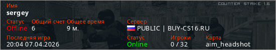 Играет на Counter Strike 1.6 сервере. Страна: РоссияПервый раз замечен 20:16 15.03.2026