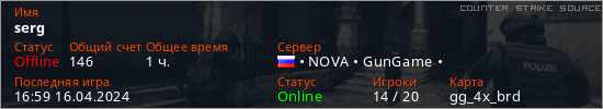 Играет на Counter Strike Source сервере. Страна: РоссияПервый раз замечен 17:34 25.08.2022
