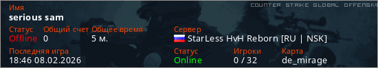 Играет на Counter Strike Global Offensive сервере. Страна: РоссияПервый раз замечен 18:34 08.02.2026