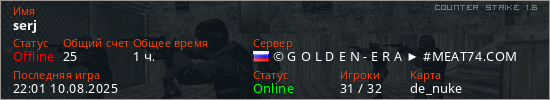 Играет на Counter Strike 1.6 сервере. Страна: РоссияПервый раз замечен 17:10 16.09.2024