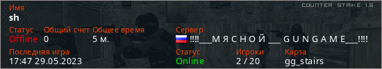 Играет на Counter Strike 1.6 сервере. Страна: РоссияПервый раз замечен 17:45 29.05.2023