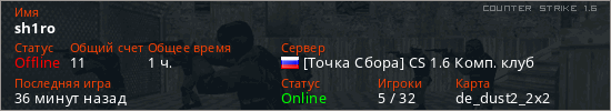 Играет на Counter Strike 1.6 сервере. Страна: РоссияПервый раз замечен 15:34 19.04.2026