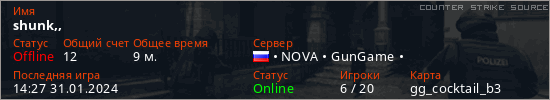 Играет на Counter Strike Source сервере. Страна: РоссияПервый раз замечен 14:21 31.01.2024