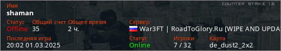 Играет на Counter Strike 1.6 сервере. Страна: РоссияПервый раз замечен 10:27 30.06.2022