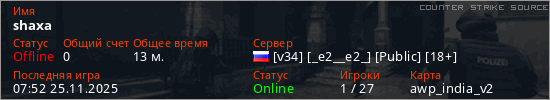 Играет на Counter Strike Source сервере. Страна: РоссияПервый раз замечен 11:22 14.05.2024