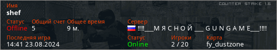 Играет на Counter Strike 1.6 сервере. Страна: РоссияПервый раз замечен 13:23 02.08.2024