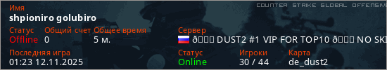 Играет на Counter Strike Global Offensive сервере. Страна: РоссияПервый раз замечен 01:20 12.11.2025