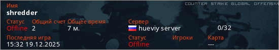 Играет на Counter Strike Global Offensive сервере. Страна: РоссияПервый раз замечен 15:30 19.12.2025