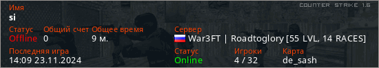 Играет на Counter Strike 1.6 сервере. Страна: РоссияПервый раз замечен 18:34 15.11.2024