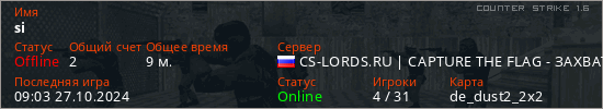 Играет на Counter Strike 1.6 сервере. Страна: РоссияПервый раз замечен 11:43 17.09.2024